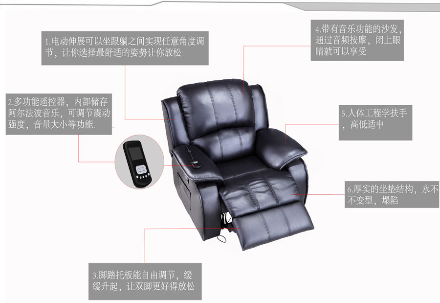 3、隨意調節——電動伸展可以坐與躺之間實現任意角度調節,讓您選擇最舒適的姿勢進行放松, 多方位音樂按摩身體,令您快速入睡,幫助您實現"完美睡眠"。