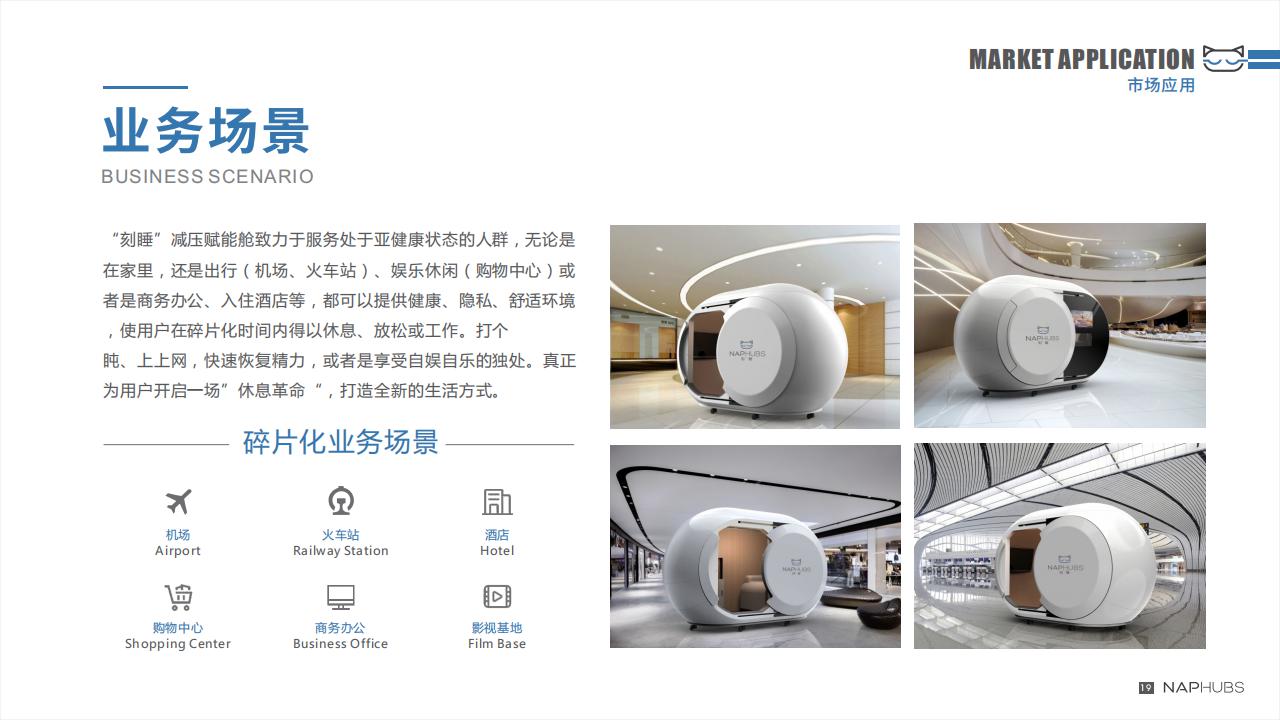 “睡一會(huì)”可放置在商場(chǎng)、機(jī)場(chǎng)、酒店、景區(qū)、辦公大樓等場(chǎng)所。休息艙不僅適用的場(chǎng)景比較廣泛,還可以碎片化布局,靈活設(shè)置所在位置,為用戶提供便捷的“補(bǔ)覺”場(chǎng)所,讓短時(shí)休息更加舒適溫馨。